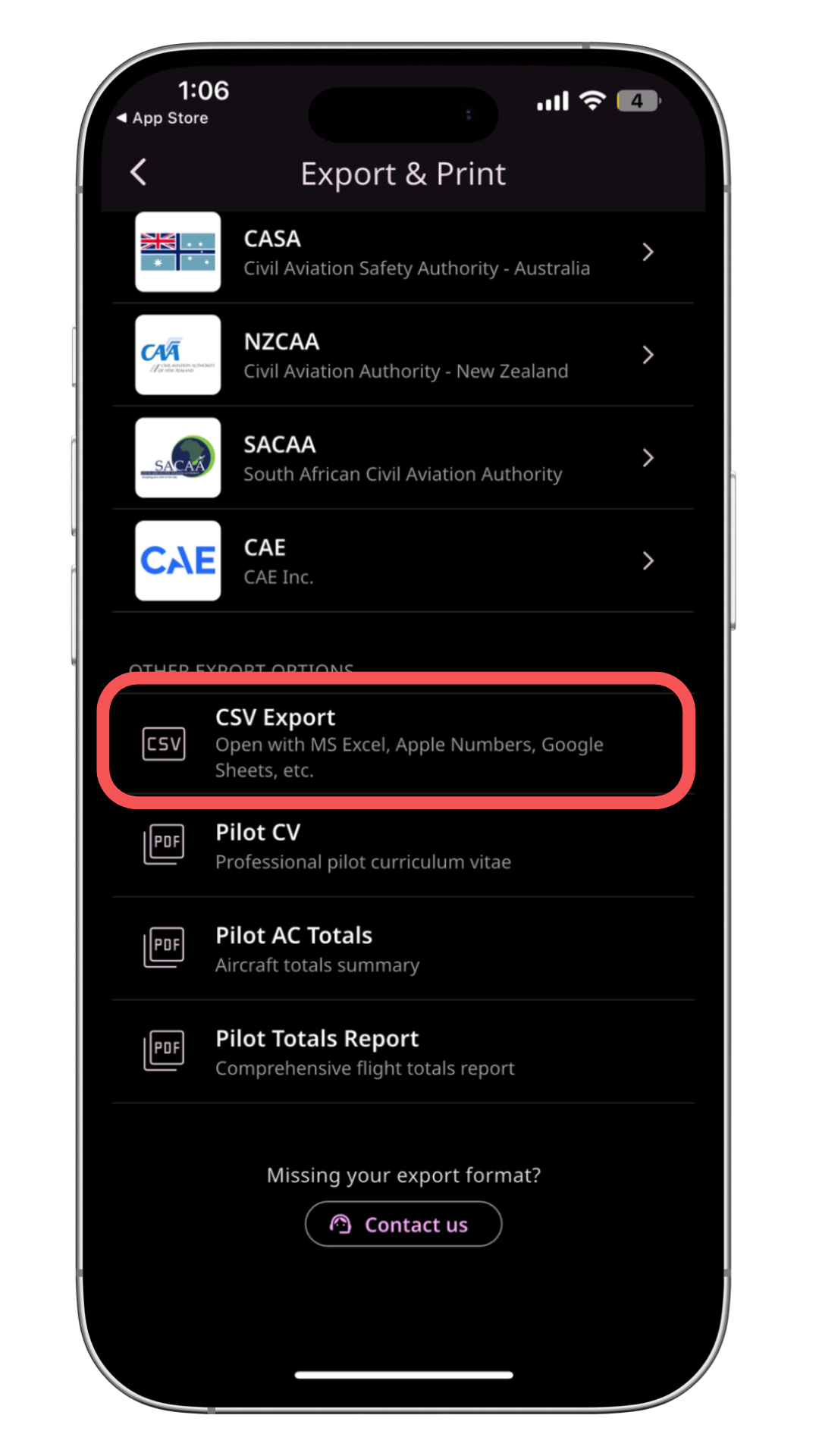 FLYLOG.io allows you to export your entire logbook as a CSV file directly from the mobile app.